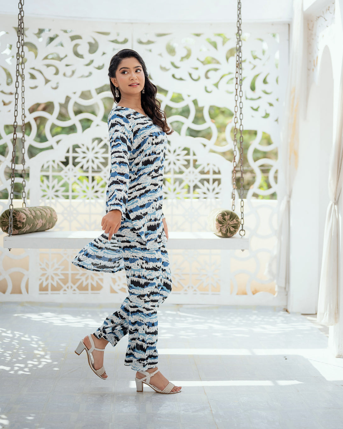 Fabric: Soft, breathable non-lawn material. Digitally Printed Abstract Pattern. Relaxed & Flattering Fit. Ideal for Daywear, Travel, or Lounge Style. Easy to Pair with Flats or Heels.